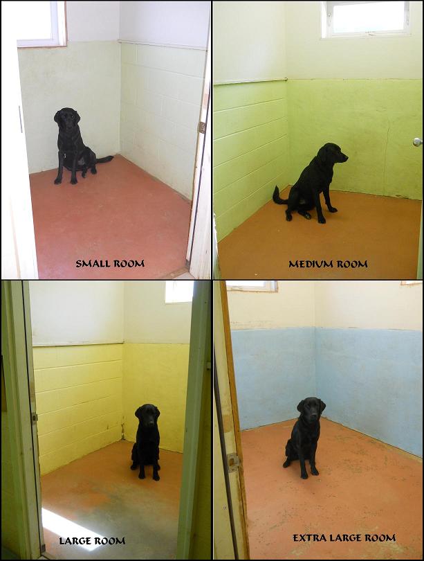 For your canine companions, we offer individual suites of various sizes to accommodate all guests comfortably. Our facility consists of 17 suites varying in sizes for your 35lb and over dogs. We have 5X6 foot rooms, 6X7 foot rooms, 8X8 foot rooms, and 8X15 foot rooms. Each dog will be provided with his/her own water bowl in their room at all times. Heartstrings provides bedding (blankets, sheets, bedding, carpets), but feel free to bring in your dogs bed from home if it makes him/her feel more comfortable. We can also provide pre-shredded bedding for those who tend to destroy theirs during their visit, and we may replace your personal bedding with ours if we notice destructive behaviors to save their own. Pictured below are all four room sizes with Ruger, a 52lb Lab, posing for a size comparison.